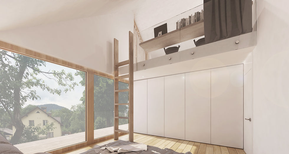 The new build is conceptually a two-piece set up: the light bottom used as a pedestal and a timber mass on top that seems like it's floating through air. The pitched roof continues the idea of the existing storage building next to it by copying its texture and incline. The timber façade is repeated on the old building only it's reversed, with a timber bottom and light grey top. The connection of the two buildings is a raw concrete flat roof to highlight the main entrance on the side of the house.